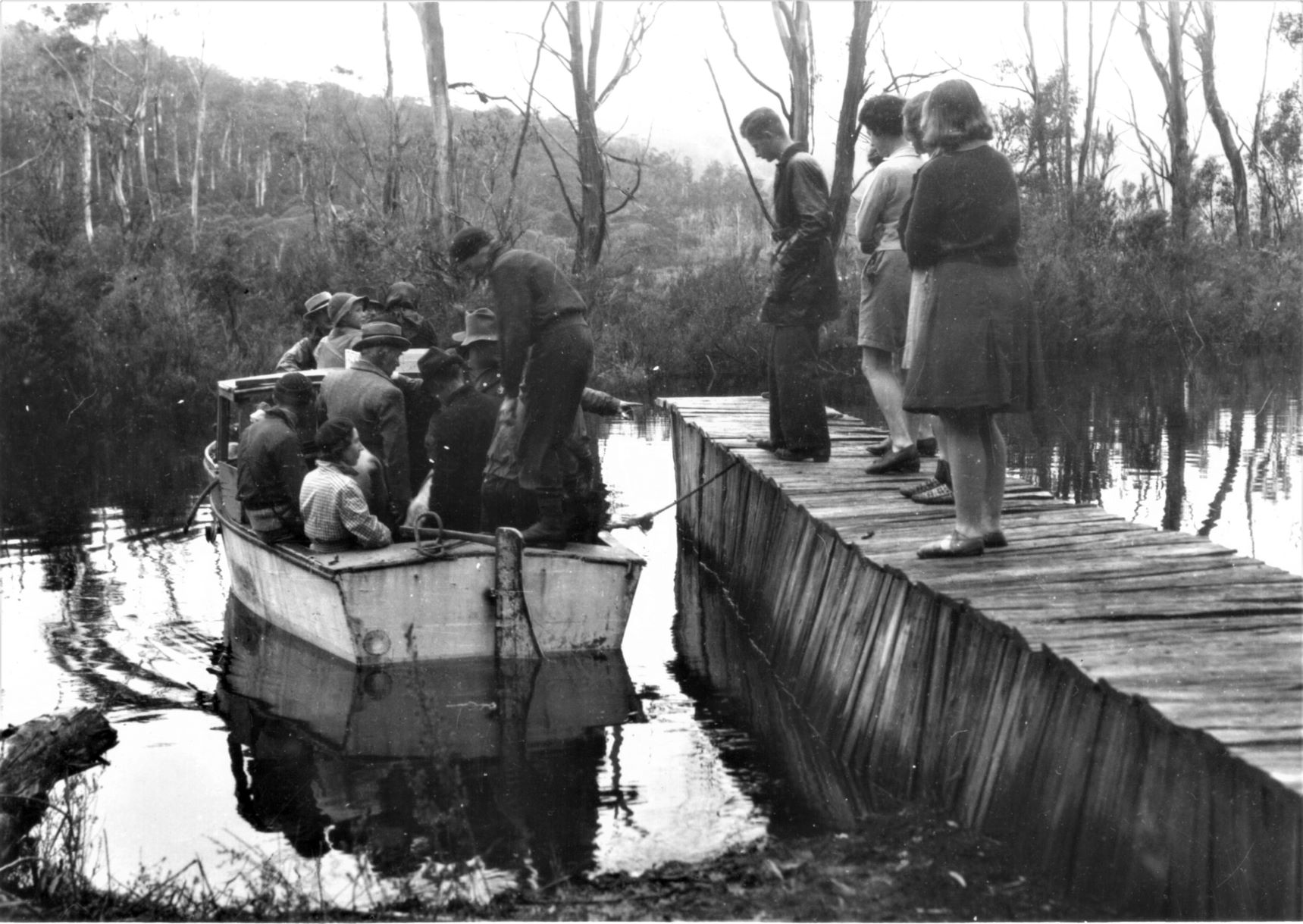 I think our lovliest {sic] picnic spot was a little pebbly speech on the shores of Dove Lake. The beauty of the spot and even the sight of Cradle frowning down upon us, failed to subdue the irrepressibles, who were madly engaged in getting as much of the beach as possible down each others’ backs. So to keep them quiet we set them to work getting our lunch. Our host had once been busy on that beach making a raft and the pair found too paddles roughly cut out of planks. These they seized and pressed into service as bread board and meat dish respectively. Mona soon had a nice little pile of bread and butter on one end of their respective paddles and solemnly marched round and served the waiting circle.