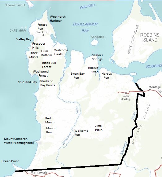 The Woolnorth property showing its original eastern boundary. TOPOGRAPHIC BASEMAP FROM THELIST copyright STATE OF TASMANIA