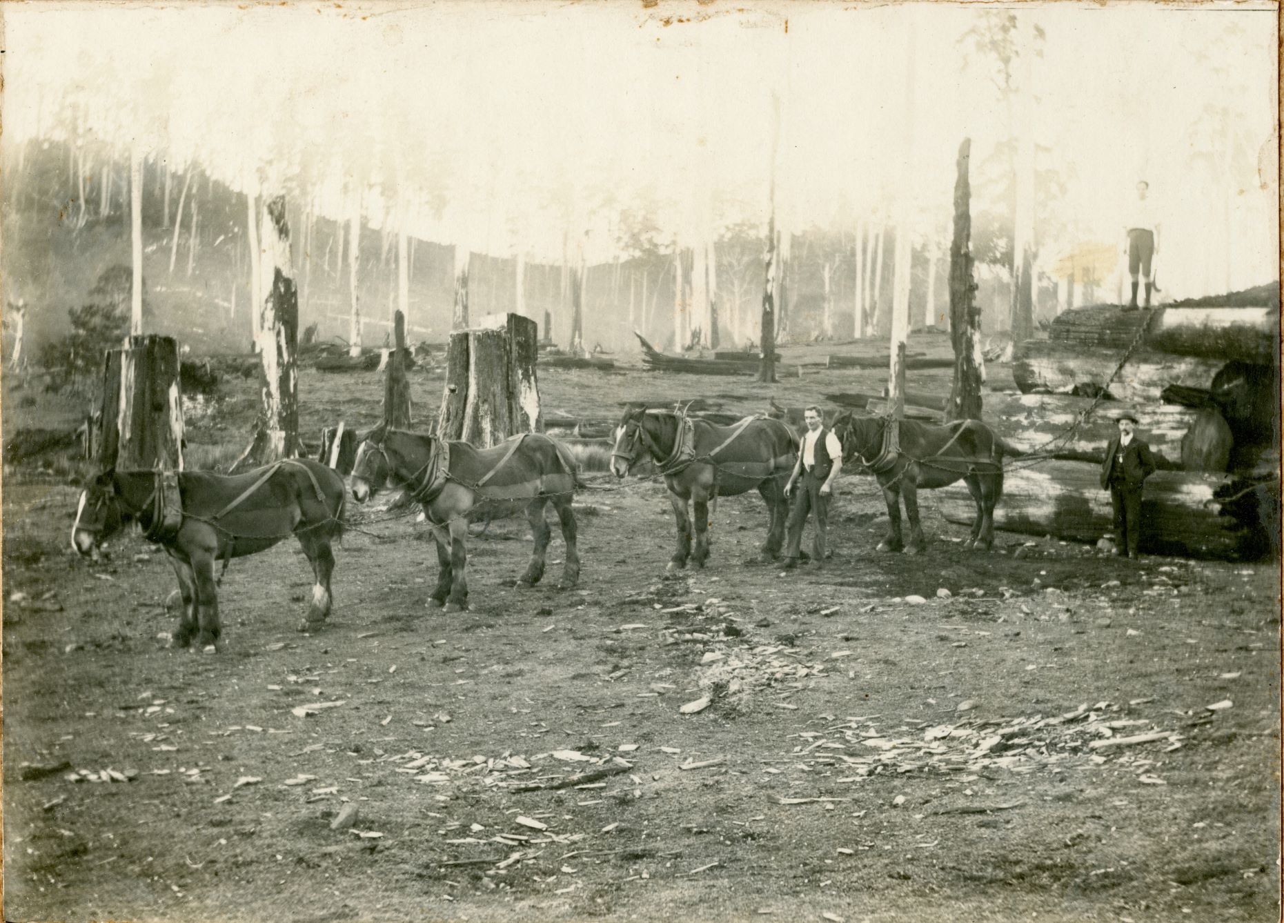 Jack (aka Johnny) Carter, Bill ‘Yorky’ Smith and Jack ‘Boy’ Griffiths clearing land at Narrawa. Griffiths, standing precariously on the log stack, was later killed in a similar operation on the Williams farm. Courtesy of Peter Carter.