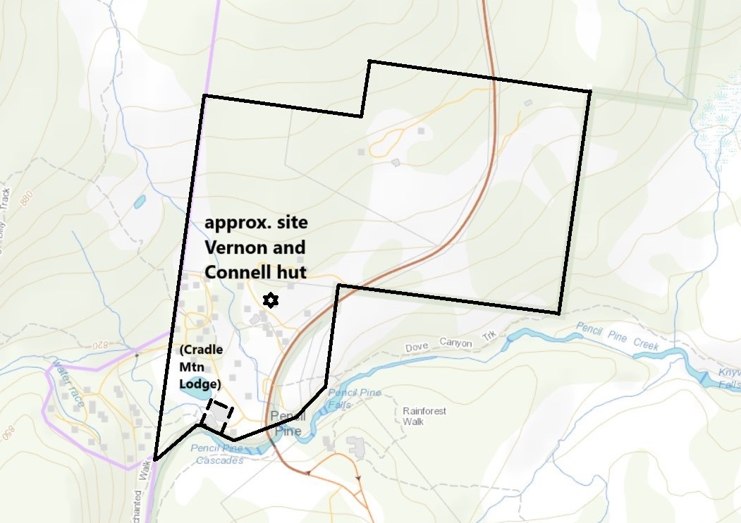 The Vernham and Connell 99-acre block at Pencil Pine Creek. TOPOGRAPHIC BASEMAP FROM THELIST© STATE OF TASMANIA
