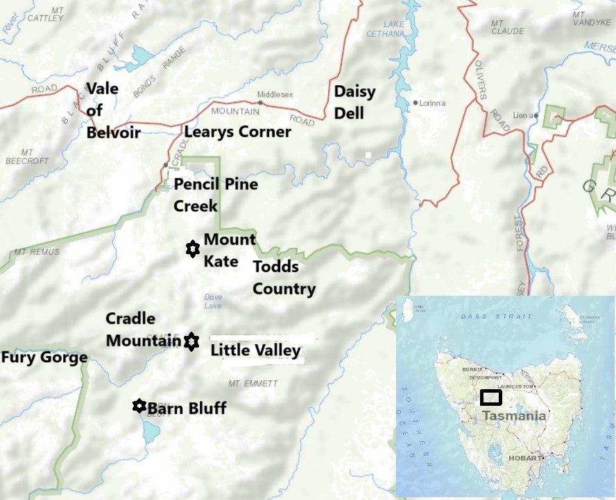 [12] Gustav Weindorfer diary, 12 July 1914 (Pencil Pine Creek), 23 July 1914 (east side Mount Kate), NS234/27/1/4 (TA); 10 July and 10 August 1925 (Pencil Pine Creek) (QVMAG). Es Connell, interviewed by Nic Haygarth on 23 September 1997, confirmed the location of this hut.